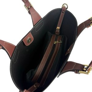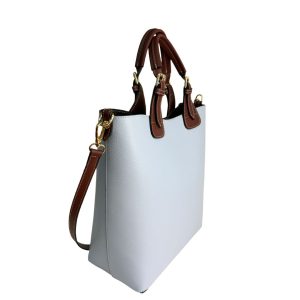 The MADDY Two Tone Tote (25x29x13cm) is crafted from Dollaro leather with dark brown handles featuring white stitching. It includes a detachable zipped pouch, an unlined interior, and an adjustable shoulder strap, all finished with elegant gold-toned hardware.