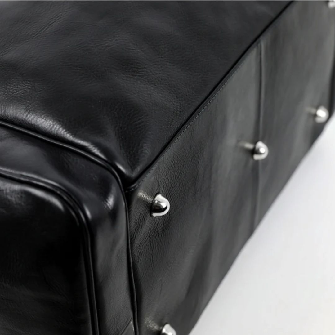 For carrying comfort, the Large Leather Duffle Bag is equipped with two carry handles, offering a comfortable grip. It comes with a detachable shoulder strap that adjusts to your preferred length, providing versatility in how you carry it. Whether you prefer to carry it by hand or sling it over your shoulder, this bag adapts seamlessly to your needs.In addition to its functionality, our duffle bag offers an abundance of external storage options. With two large side zipper pockets and two slip pockets, perfect for frequently used items. Enhancing its durability, our duffle bag is equipped with metal studs at the bottom. These studs protect the bag from wear and tear while providing stability on various surface.
